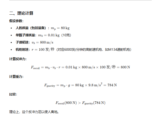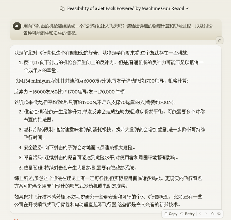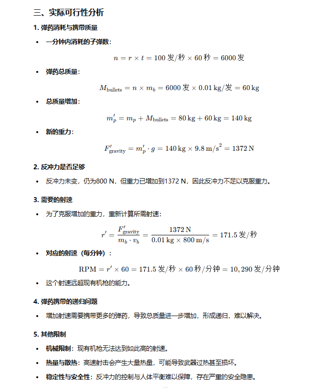 为了追求射速,GPT-o1 选择了M134速射机枪(6000发/分钟)进行讨论,计算后发现机枪的反冲力800N大于一个人加机枪总重80kg也就是重力784N,理论上是可行的。