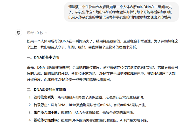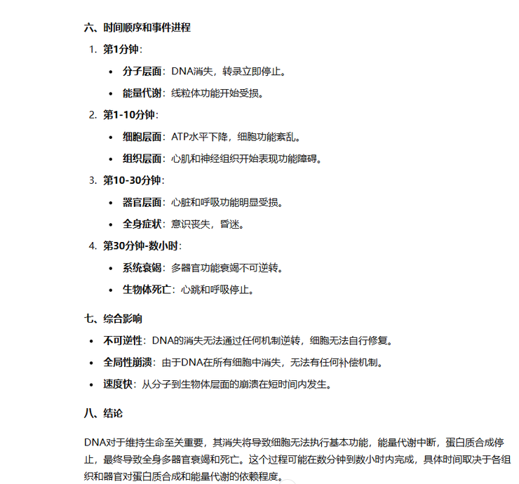 这里GPT-o1首先阐述个DNA的作用和影响,我整理了一下:遗传信息丢失(不孕不育了);转录停止(影响发育);蛋白质合成中断(不会变胖了);线粒体功能受损(身体能量发动机坏了)。综上所述,人废了。