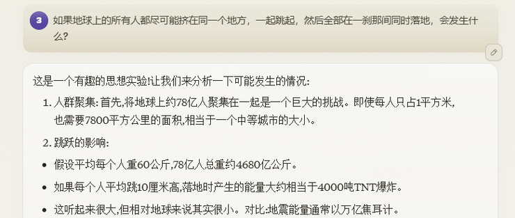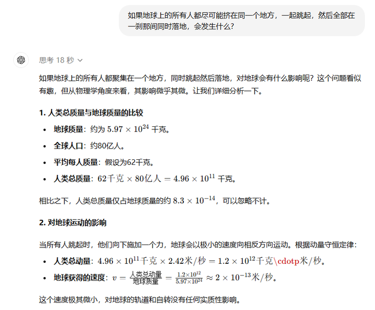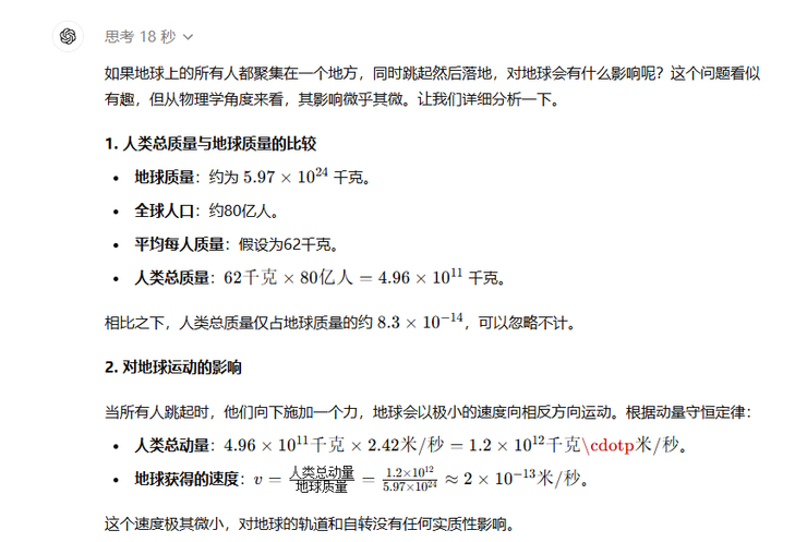 这个问题AI思考18秒经过计算告诉咱先别担心,地球的质量是人类总质量的10万亿倍以上,所以人类跳起来落下去地球反方向移动的距离约等于一个原子核大小的宽度……