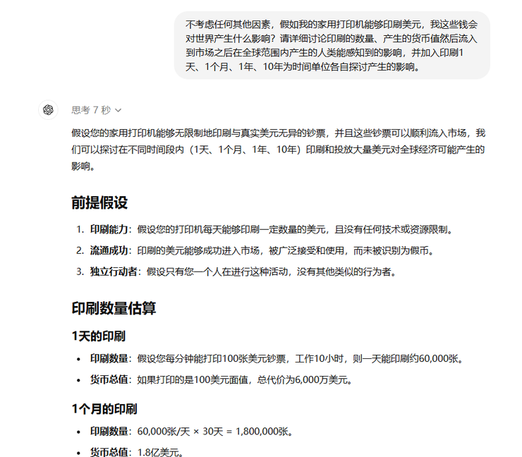 这道题其实GPT-o1的回答还是挺厉害的。它识别到了打印能力被限制在家用打印机上,所以GPT-o1需要考虑一台家用打印机通常每分钟只能打印20~30张A4纸大小的打印纸(大概能放下4张100美元的纸币),那每分钟能打印的百元美钞就是80~120张跟GPT-o1估算的100张出入不大。