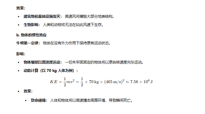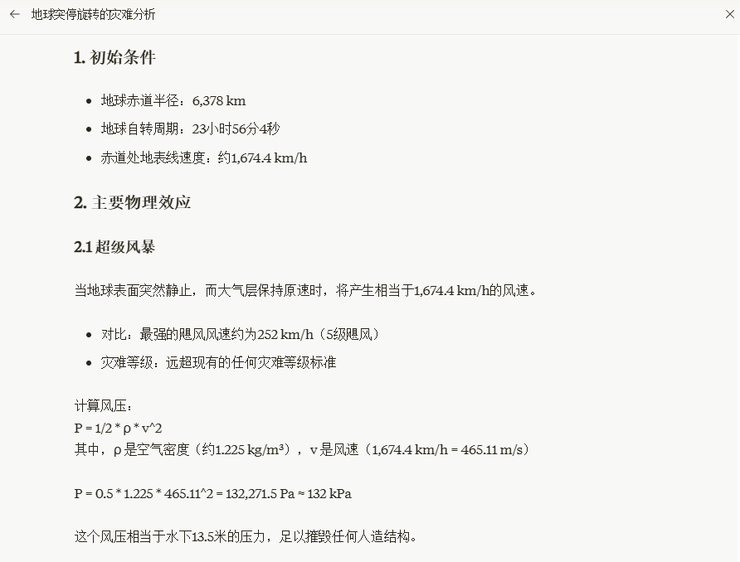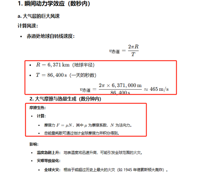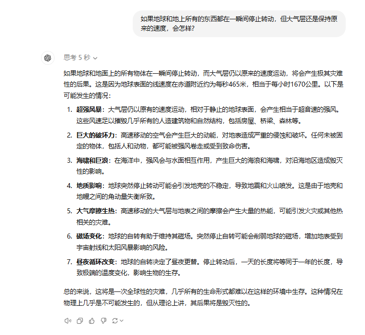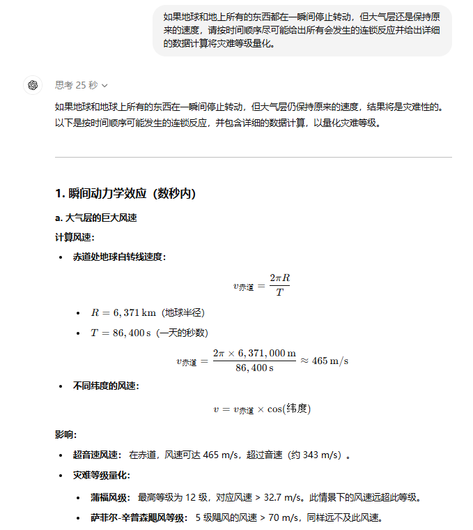 在这题中GPT-o1 倒是第一时间意识到数秒内地表会掀起超音速狂风并且离赤道越近风速越大(最大可达343m/s)。