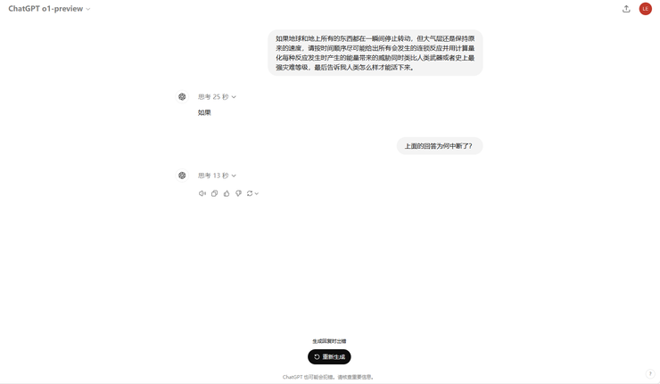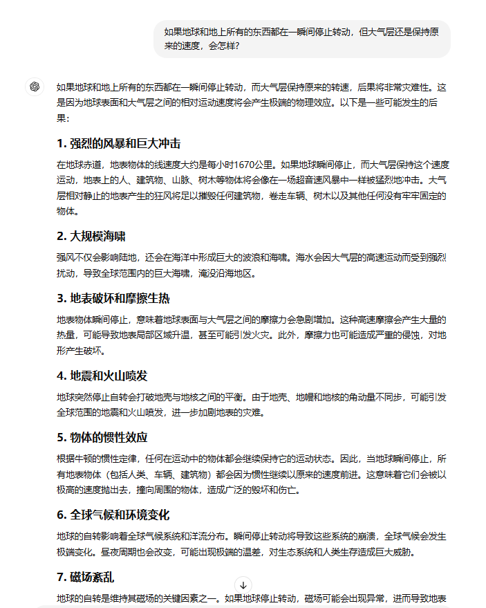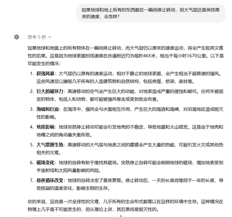 但在随后的地球停止自转的连锁反应测试中我发现,随着思考内容的复杂化GPT-o1居然产生了惰性回答的很简洁。
