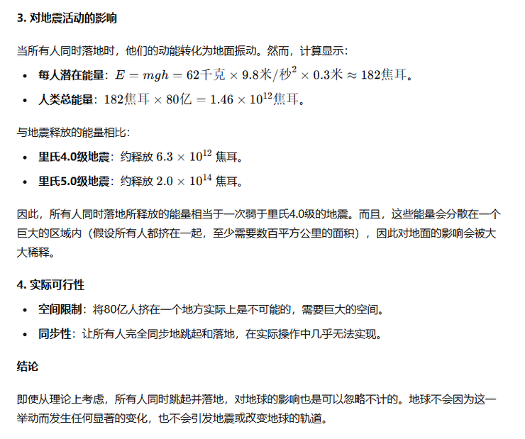 其次所有人落地产生的能量还弱于4级地震并且由于大家站的空间至少数百平方公里,所以大概等于给地面挠了个痒。