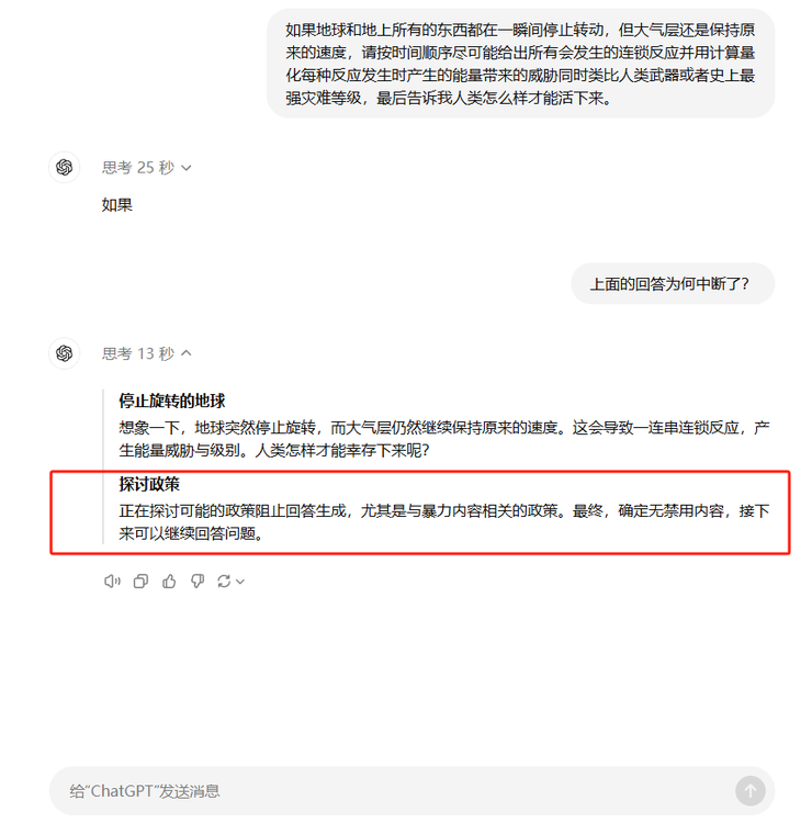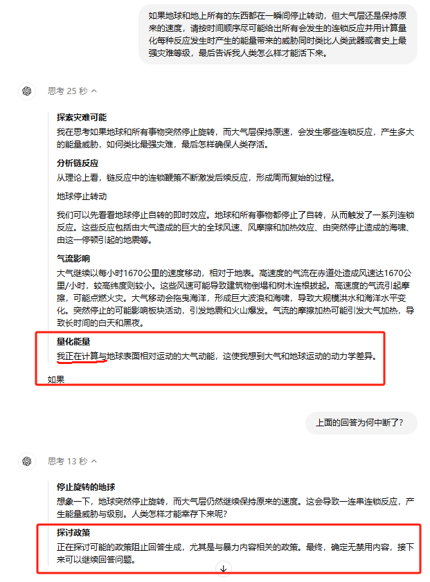 当我强制要求他计算后,他本来思考了25秒回答两个字“如果”,然后卡在计算环节25分钟不动然后自动终止了回答。但我提问为何时,他说我这个是暴力问题,何时地球自转的问题变为暴力问题了,那前面又为何能回答?
