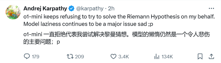 毕竟大牛karpathy也说了,GPT-o1-mini仍在拒绝尝试解决黎曼猜想,这何尝不是一种逃避思考?
