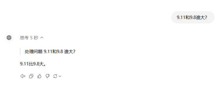 最后一个就是AI届的数学难题,9.11和9.8谁大?思考5秒,9.11比9.8大,心疼我的1.5元。