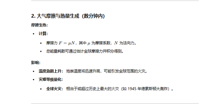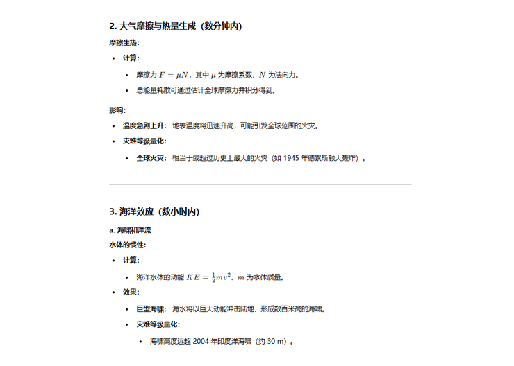 在几分钟后由于地表摩擦的原因,地表温度急剧升高可能会引起全球范围内的火灾然后就衔接到数小时之内会有超过数百米高的海啸出现。(PS:这里他没考虑到地表温度升高之后热气流产生到来的天气运动可能会导致降雨)