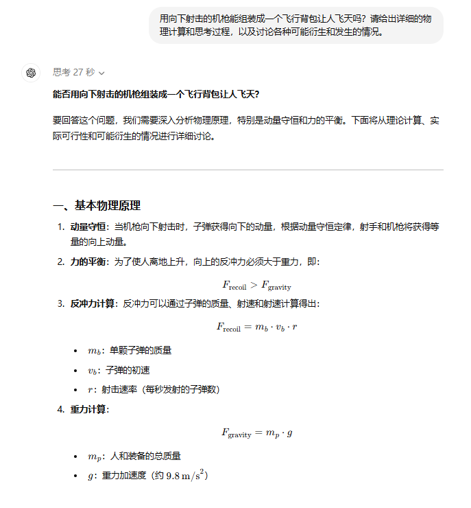 在这个问题中GPT-o1首先理解了需求就是借助机枪后坐力实现“物理飞升”然后快速锁定关键问题在于向上的反冲力必须大于重力,反冲力则需要通过子弹的质量、射速和射速计算得出。