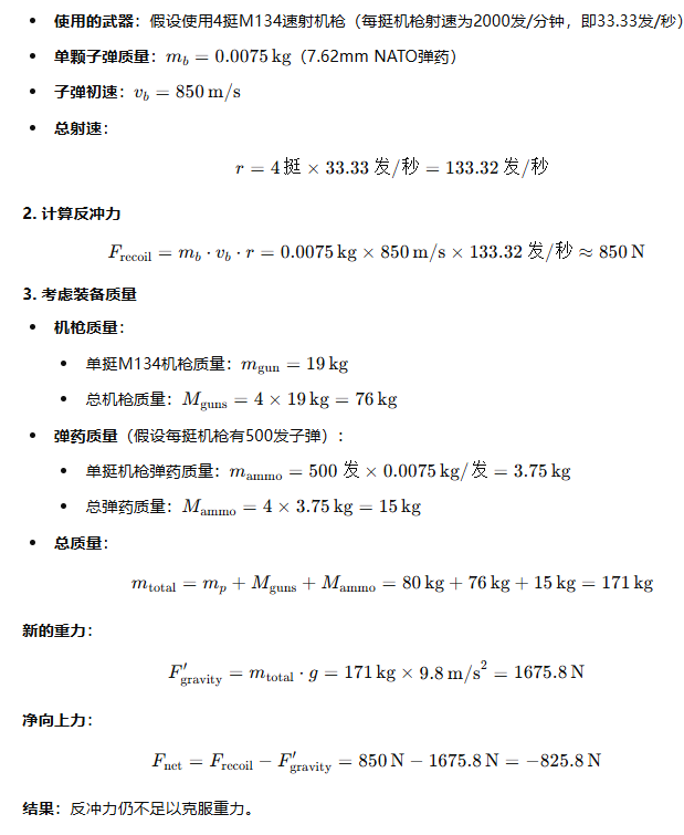 o1随后发现还要考虑子弹重量的问题,假定使用1架M134射击1分钟需要6000发子弹,子弹的总质量为60kg,则新的重力为1372N,机枪反冲力800N没变的情况下不足以让人升天。