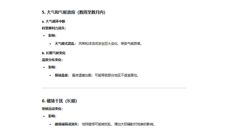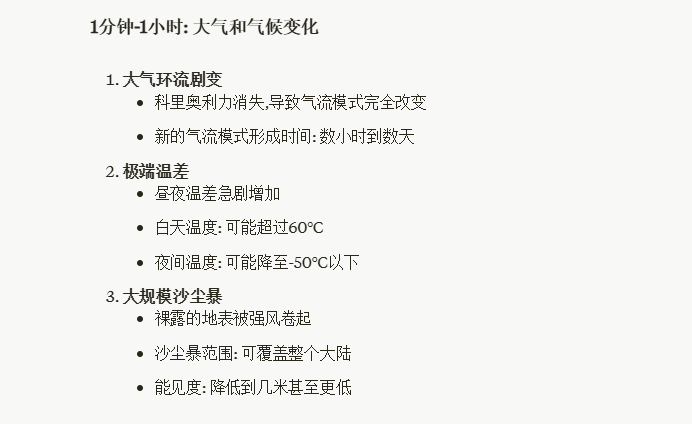 物理天气连锁反应:大气层运动导致狂风→狂风卷起沙尘暴→狂风摩擦地面生热→由于地表摩擦狂风会停止但地表温度升高→空气最潮湿的地区将形成全球性的雷暴→横扫海面的大风引起海啸后,风暴会将深处冰冷的海水带到表层,冰冷的水珠遇上炽热的空气会有暴雨→地球停止自转东西半球昼夜更替的时长变为1年→昼夜温差加大→光合作用失效地球氧气大幅减少……