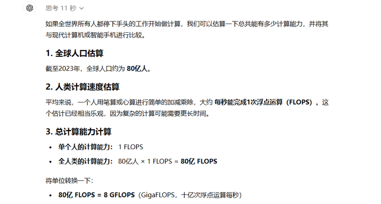 这算是一道比较简单的数学和逻辑推理题,o1思考了11秒,得出的结论是全人类心算/笔算的算力总和约8 GFLOPS。