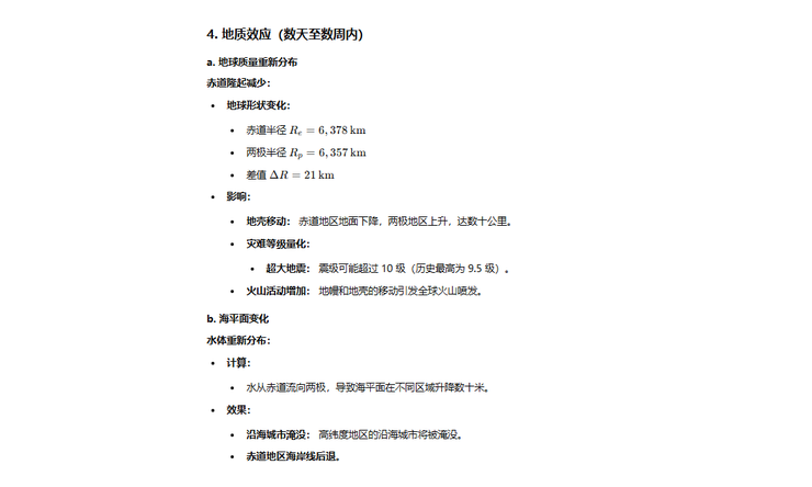 在接下来的几天到几周时间地球质量会重新分布,赤道会下降、南北极会上升数十公里,也就是地球会从一个椭圆趋向于变成一个球体。伴随而来的就是频繁的超10级大地震。
