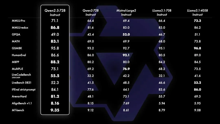 根据上图,Qwen2.5-72B 在14 个关键基准测试中,8 项击败了 llama3.1-405B 指微调模型,11 项击败了Mistral最新开源的 Large-V2 指令微调模型,成为目前最强开源模型。
