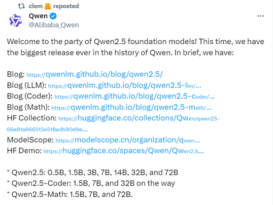 Qwen2.5延续了“全尺寸、多模态”路线,同步开源了多个尺寸的大语言模型、多模态模型、数学模型和代码模型,涵盖基础版本、指令跟随版本、量化版本,总计上架超过 100 个开源模型,刷新业界新纪录。