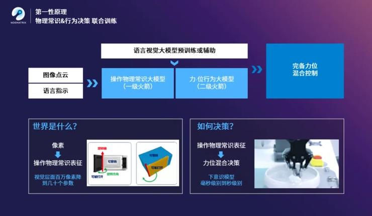 穹彻智能则是从第一性原理出发打造两级火箭大模型:一级火箭是实体世界大模型,能在训练中让机器人掌握常识性的、低维的操作物理表征,从而理解客观物理事实,并与人类概念对齐;二级火箭是机器人行为大模型,能充分耦合操作物理常识表征和执行体的高精度力反馈能力,从而作出仿人化的力位混合的行为决策,让操作兼具鲁棒性和通用性。