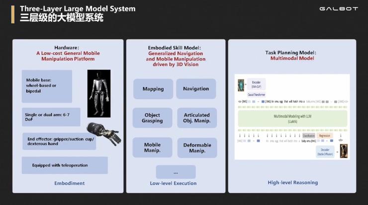 硬件(如末端执行器)为最底层,旨在打造低成本的通用移动操作平台;中间层是负责 low level 执行的具身技能模型,是由 3D 视觉驱动的通用导航和移动操作,能完成自主建图、自主导航、物体抓取、开门开抽屉开冰箱、挂衣服叠衣服柔性物体操作等任务;最上层是负责 high level 推理规划的多模态大模型,可以调度中间技能 API,来实现完整的从任务的感知、规划到执行的全流程。
