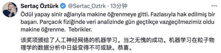 另一位物理学教授也给出了自己的看法,机器学习在粒子物理学的数据分析中可是不可或缺的关键技术,能拿诺贝尔奖当之无愧。