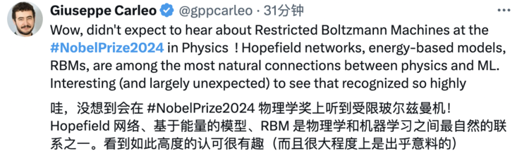 另一位量子学副教授也解释说,Hopefield 网络、基于能量的模型、RBM 是物理学和机器学习之间最自然的联系之一,能看到看到诺贝尔物理学奖高度认可这一点既意外又开心。