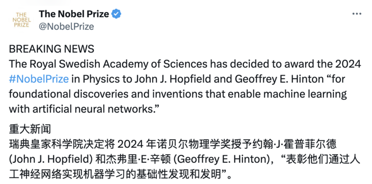 就在刚刚,瑞典皇家科学院决定将 2024 年诺贝尔物理学奖授予约翰·J·霍普菲尔德 (John J. Hopfield) 和杰弗里·E·辛顿 (Geoffrey E. Hinton),“表彰他们通过人工神经网络实现机器学习的基础性发现和发明”。