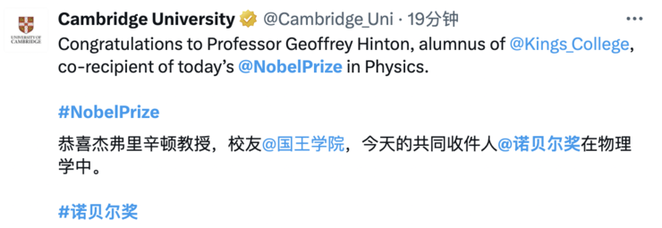 剑桥大学火速转发了官方推文,祝贺校友 Geoffrey Hinton 荣获诺贝尔物理学奖。