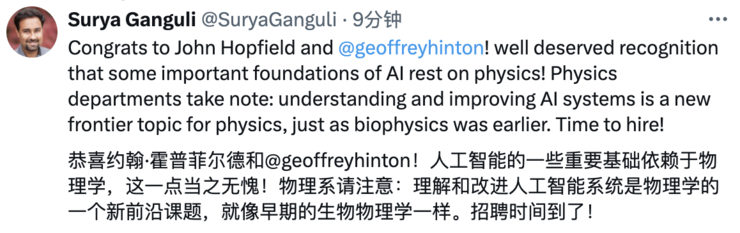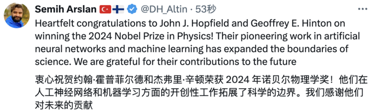 推特网友也纷纷发来贺电,恭喜 Geoffrey Hinton 和 John Hopfield 拿下诺贝尔奖。
