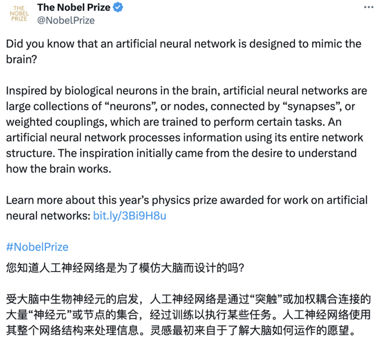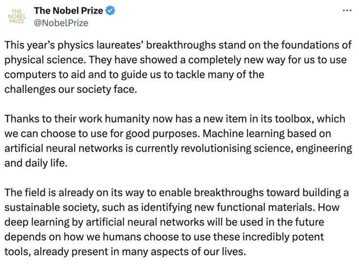 以下则是瑞典皇家科学园新闻稿给出的两位获奖者获奖原因的解释(原文见:https://www.nobelprize.org/prizes/physics/2024/press-release/):