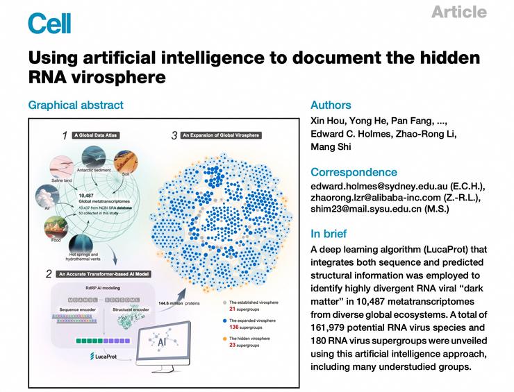 不仅诺贝尔物理和化学奖双双颁给 AI 领域的科学家,阿里云与中山大学的科研也带来了RNA病毒寻找的突破,国际顶级学术期刊《Cell》收录了这一研究论文。