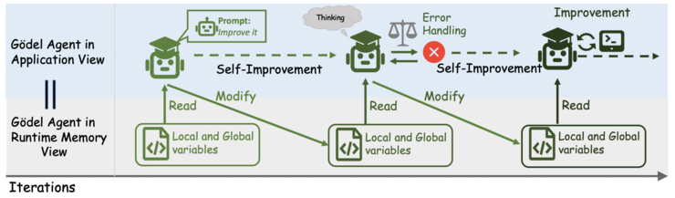 通过检查运行时内存实现自我意识:Gödel Agent 通过检查运行时内存,特别是 Python 中的局部和全局变量,来实现自我意识。这一能力使代理能够提取和解释构成环境和代理自身的变量、函数和类,符合系统的模块化结构。通过自省这些元素,智能体获得对自身操作状态的理解,从而可以相应地进行调整。