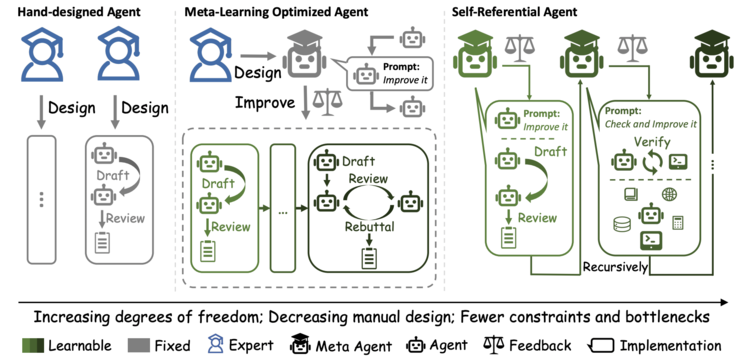 而且对比现有的智能体,只有 Göodel Agent 可以不受任何限制地递归地改进自身。手工设计的智能体依赖于范围有限且劳动密集型的人类专业知识,元学习优化智能体则受到了固定元学习算法的约束。