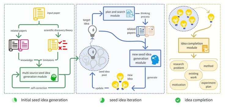 多源种子想法生成:Nova模型通过多种科学发现方法生成初始种子想法,确保生成的想法具有多样性和创新性。