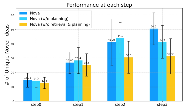 历史证明,突破性的Idea具有开启新技术纪元的潜力——比如Transformer的出现引领了波澜壮阔的AGI时代,ImageNet极大地加速了深度学习的发展,而最近的诺贝尔奖授予了几位AI领域的科学家,也标志着AI发展史上的一个重要转折点。如今,Nova正站在这样的历史节点上,以2.5倍于AI scientist的Idea生成能力,迅速在科研领域掀起新一轮风暴。直观地说,当AI scientist还在思考第2个Idea时,Nova已经提出了5个高质量的创新Idea,每一个都有可能成为开启未来科技新纪元的钥匙。