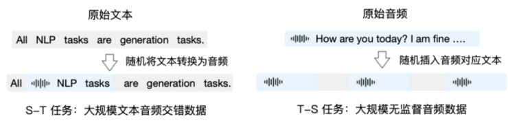 而在预训练方面,为了攻克模型在语音模态下的智商和合成表现力两个难关,智谱将 Speech2Speech 任务解耦合为 Speech2Text(根据用户音频做出文本回复) 和 Text2Speech(根据文本回复和用户语音合成回复语音)两个任务,并设计两种预训练目标适配这两种任务形式: