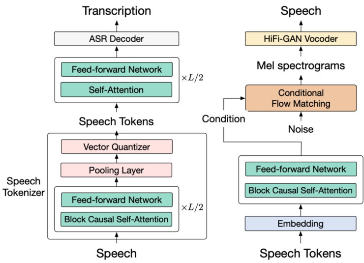语音合成方面,则采用了 Flow Matching 模型流式从音频 token 合成音频,最低只需要 10 个 token 合成语音,最大限度降低对话延迟。