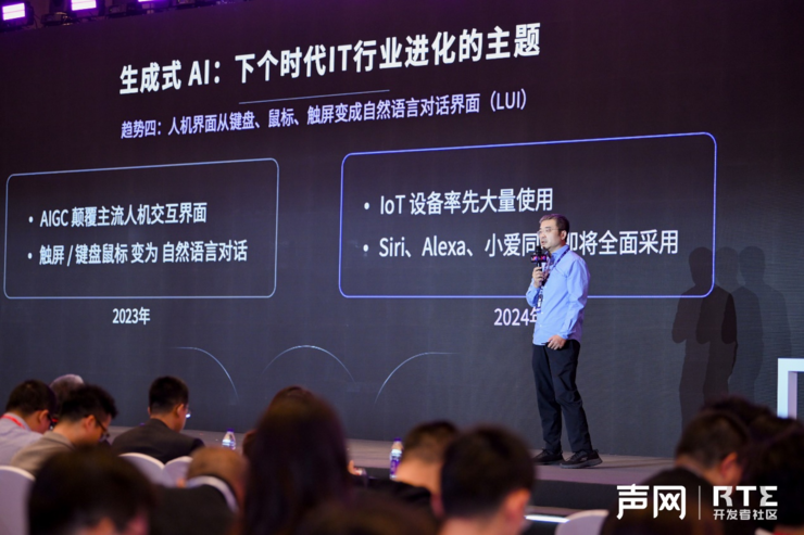 迄今,RTE大会已经是第十届,十年如一日地每年坚持举办,从未间隔。恰逢GenAI爆发,声网深耕的RTC(实时音视频)技术,让人与AI的交互不再局限于文字,也可以通过语音通话进行生动、流畅的低延时交互,这也成为当下国内外大模型厂商新的发力点——多模态。