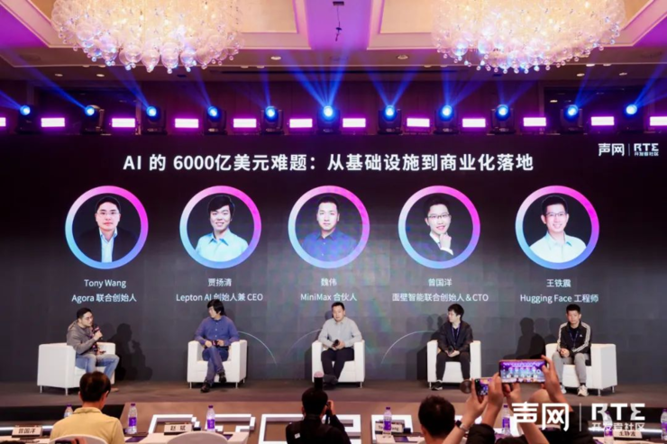 大会最精彩的一部分便集中在在圆桌讨论环节,就AI的 6000 亿美金难题,Lepton AI 创始人兼 CEO 贾扬清、MiniMax 合伙人魏伟、面壁智能联合创始人&CTO 曾国洋、Hugging Face 工程师王铁震、Agora 联合创始人 Tony Wang 五位嘉宾一起探讨了从 AI 基础设施到 AI 商业化落地的机会与挑战。