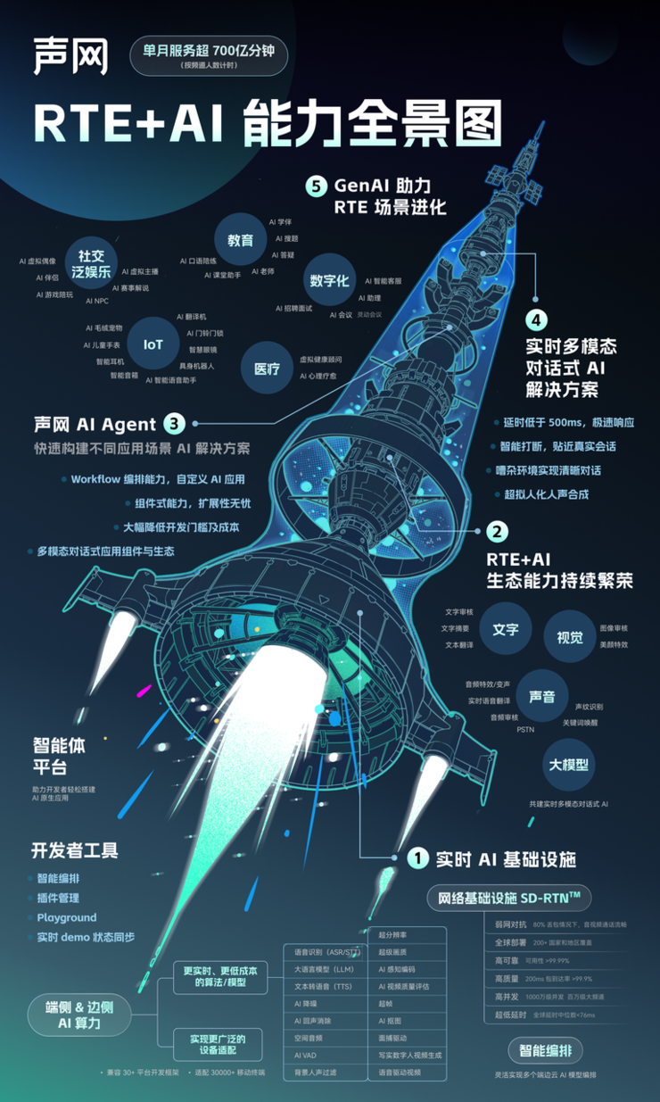 在大会上,声网发布了他们的RTE+AI能力全景图,在全景图中,声网从实时 AI 基础设施、RTE+AI 生态能力、声网 AI Agent、实时多模态对话式 AI 解决方案、RTE+AI 应用场景五个维度,清晰呈现了当下 RTE 与 AI 相结合的技术能力与应用方案。