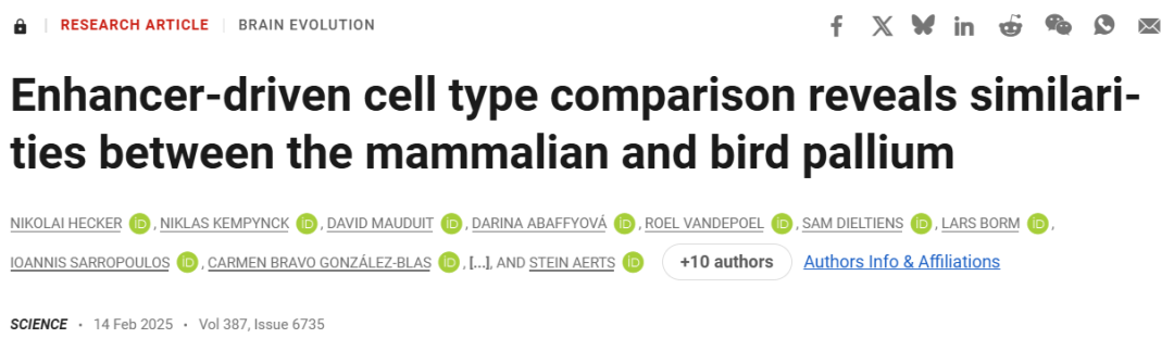 该研究以「Enhancer-driven cell type comparison reveals similarities between the mammalian and bird pallium」为题,于 2025 年 2 月 14 日发布在《Science》。