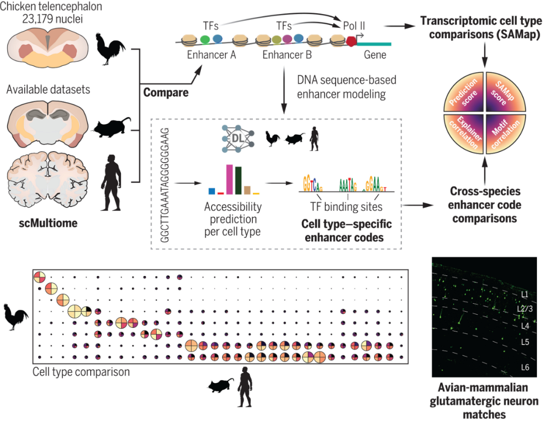 作为绘制物种间细胞类型相似性的基线,他们比较了人类、小鼠和鸡端脑细胞类型的转录组。然后,他们使用可变染色质可及性作为代理来识别潜在的基因组增强子区域并评估其细胞类型特异性。