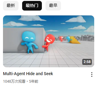 这意味着,多智能体强化学习加上复杂的模拟环境可以产生类似人类的智能行为。此工作一经发布便获得了大量关注,其官方视频至今仍是 OpenAI 在 YouTube 播放量的榜首。
