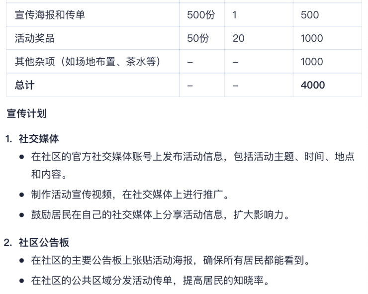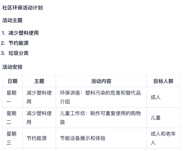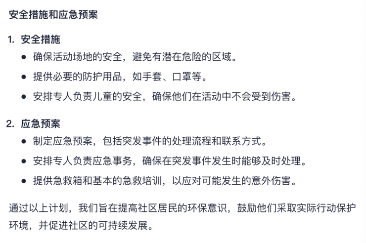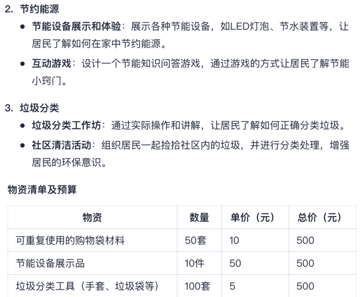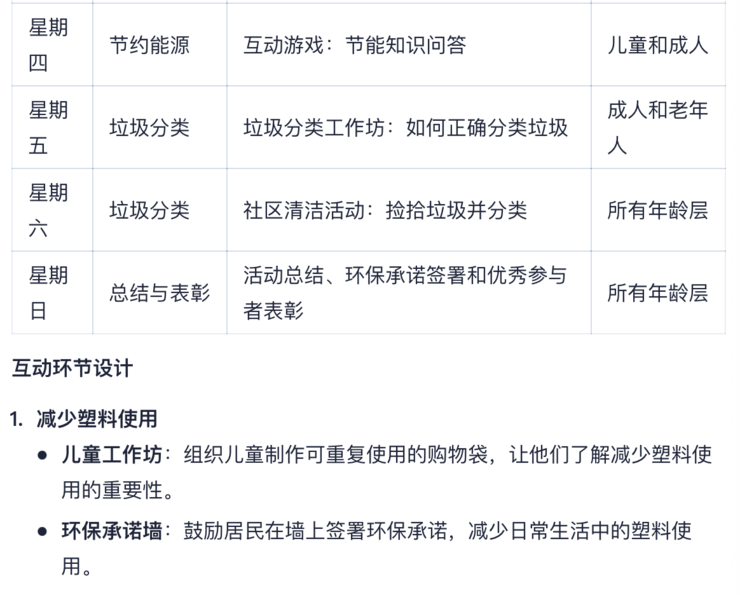 比如,向跃问提问:设计一个为期一周的社区环保活动计划。活动计划应包括每天的具体活动安排;确定至少三个不同的环保主题,如减少塑料使用、节约能源和垃圾分类;为每个主题设计一个互动环节,鼓励社区居民参与,列出所需物资清单,并估算活动预算;描述如何通过社交媒体和社区公告板宣传这次活动;考虑到不同年龄层的居民,设计适合儿童、成人和老年人的活动;确保活动计划中包含安全措施和应对突发情况的预案。