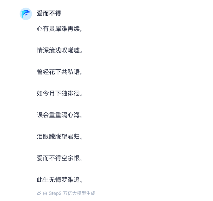 例如,在跃问中输入:写一首主题为“爱而不得”的七言律诗,表达出相爱的人因为不能相互理解而走散,充满对爱情无力、灰心的意境,得出的回答是: