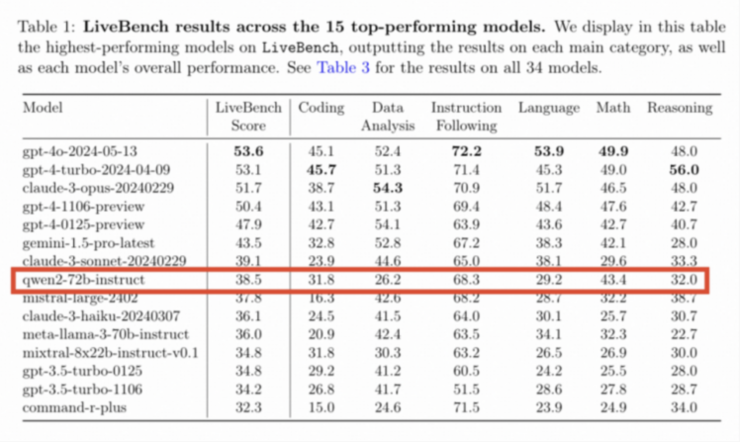 根据过往的榜单情况来看,上榜者多为国外的科技巨头,极少有国内的大模型能冲到排行榜前十,甚至大多难以上榜。2024 年到目前为止的每个月排名中,只有通义千问的开源大模型 Qwen2-72B 在 6月14 日发布的 LiveBench 的测评中上榜,排名位列第八。