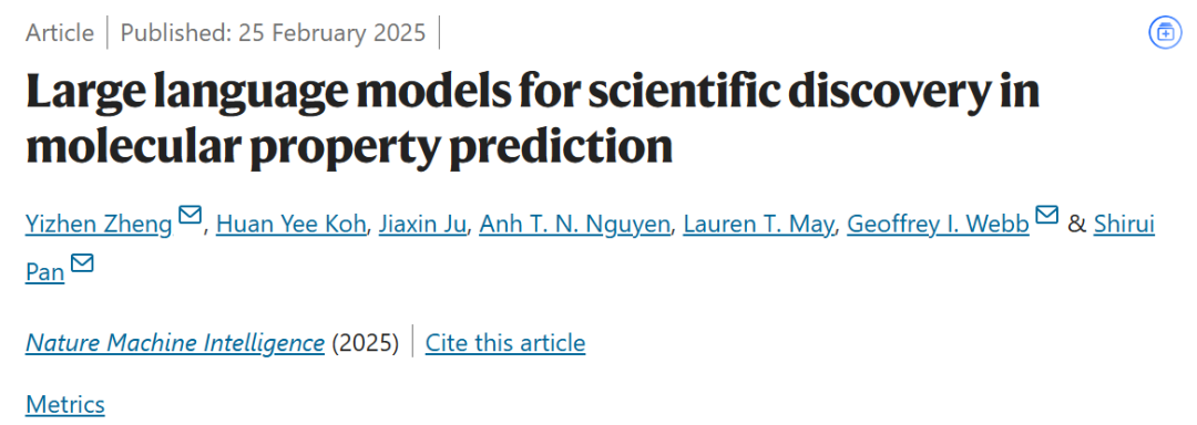 该研究以「Large language models for scientific discovery in molecular property prediction」为题,于 2025 年 2 月 25 日发布在《Nature Machine Intelligence》。