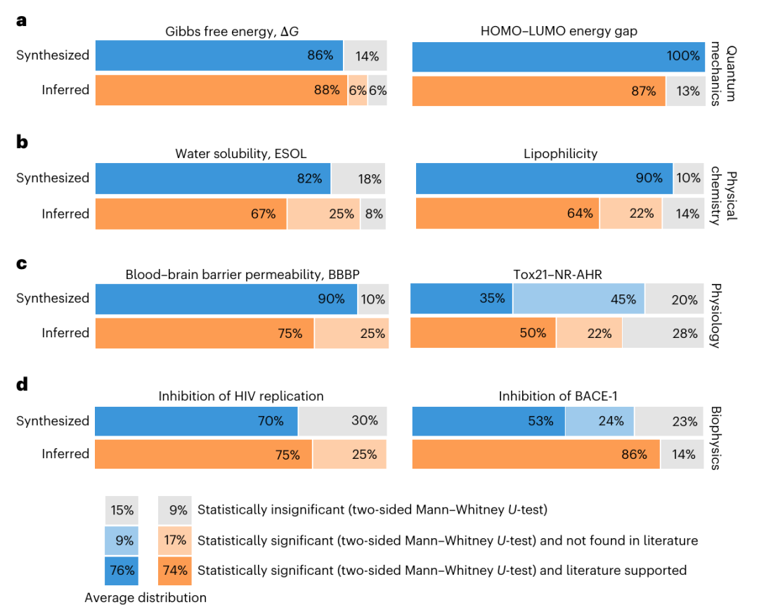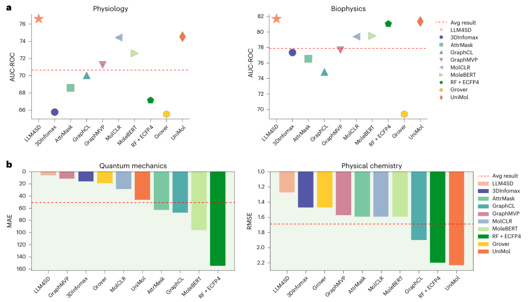 通过使用这些向量训练可解释的机器学习模型,研究人员表示 LLM4SD 在由斯坦福 PANDE 小组整理的 MoleculeNet 数据集中的 58 个基准任务中实现了分子特性预测的当前最佳水平。这些任务涵盖分类和回归,涉及四个领域:生理学、生物物理学、物理化学和量子力学。