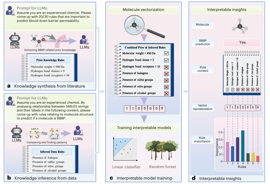 LLM 通过从科学文献中提取关键信息(如分子量与溶解度的关系)并识别分子数据中的模式(如含卤素分子更易穿透血脑屏障),将分子转化为可解释的特征向量。再结合随机森林等模型,LLM4SD 在分子特性预测任务中表现优异。