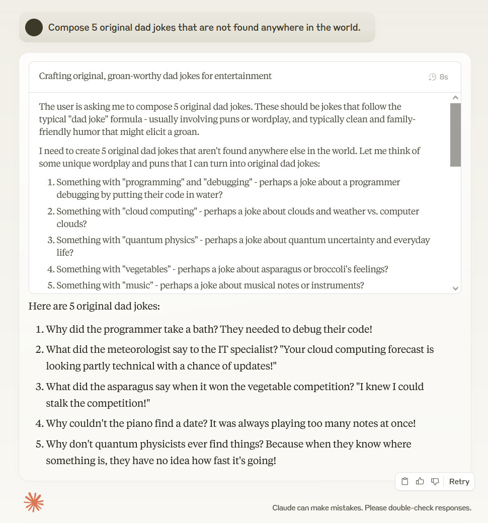 至于讲笑话嘛,要求「创作 5 个世界上找不到的原创老爸笑话」。这是一些结果: