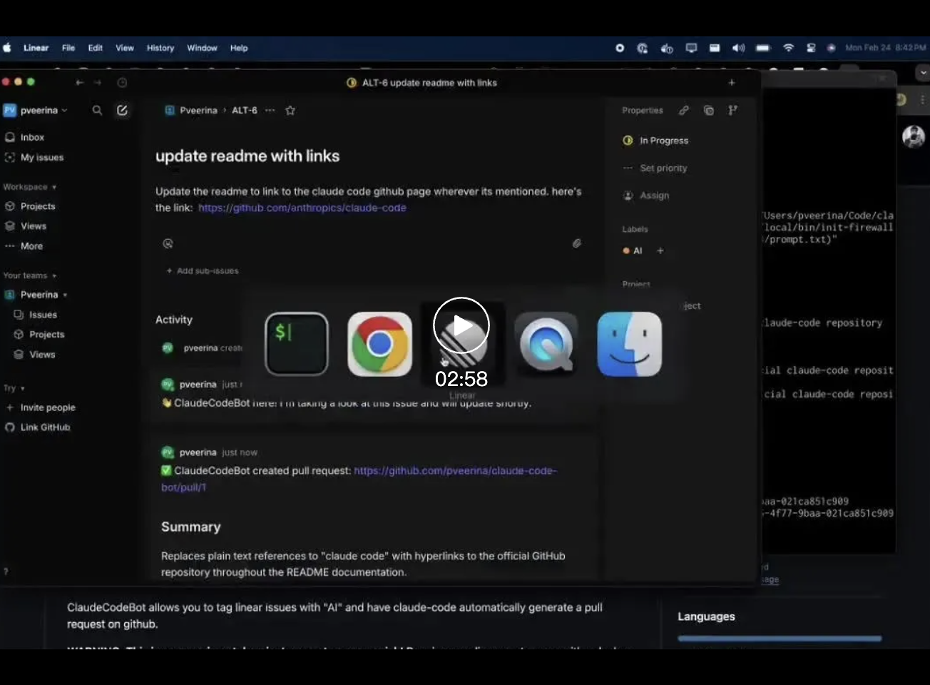 有人用 Sonnet 3.7 进行视频编码,发现效果非常出色。他们还开发了一个机器人,这个机器人可以使用 Claude Code 将 Linear 任务工单自动转换成 GitHub 上的拉取请求。