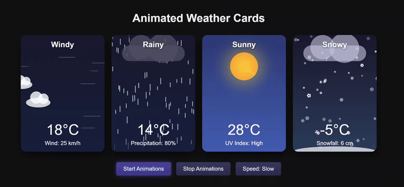 生成动画天气卡片,展示四种天气条件:风、雨、晴、雪,每种都有不同的动画效果,并且要并排显示在一个深色背景上。