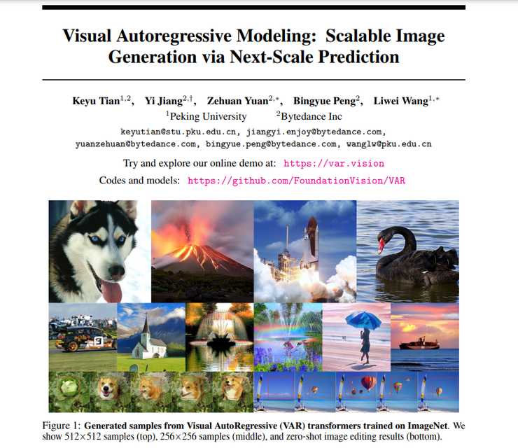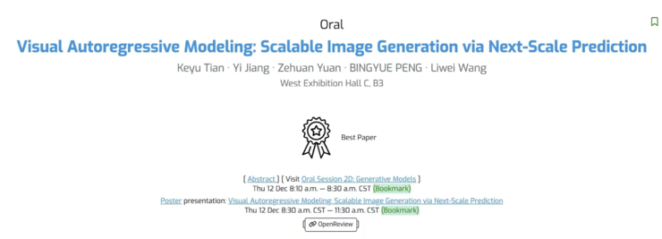 在这篇 Best Paper 中,田柯宇和其所在团队首次提出了一种新的图像生成框架,这个框架在图像合成的质量、多样性、数据效率和推理速度方面首次超越了强大的扩散模型,并且具有很好的扩展性和零样本任务泛化能力,并且这个项目已经在Github上积累了4.4k多颗星。