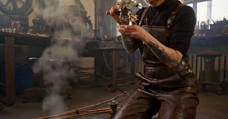 视频由腾讯混元视频生成,提示词:一位戴着复古飞行护目镜的机械师,半跪在蒸汽朋克风格的工作室里。她棕色卷发挽成发髻,零星的银色发丝闪着金属光泽。深棕色皮质工装背带裤上沾满机油污渍,袖口卷起露出布满齿轮纹身的手臂。特写她正用黄铜工具调试一只机械鸟,齿轮间冒出缕缕蒸汽,工作台上散落着铜管、发条和老式图纸。